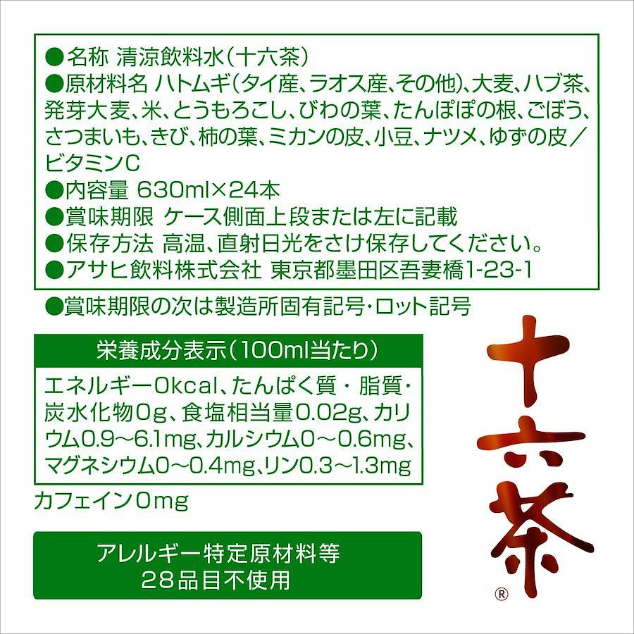 カラダにいいこと 十六茶 おいしさと健康を追求し16素材を絶妙にブレンド。 香ばしくすっきりゴクゴク飲めて、さらに16素材も摂れるカフェインゼロのブレンド茶です。商品サイズ:巾426mm×奥行き283mm×高さ228mm原材料名:ハトムギ(タイ産、ラオス産、その他)、大麦、ハブ茶、発芽大麦、米、とうもろこし、びわの葉、たんぽぽの根、ごぼう、さつまいも、きび、柿の葉、ミカンの皮、小豆、ナツメ、ゆずの皮/ビタミンC栄養成分表示(100mL当たり)エネルギー0kcal,たんぱく質0g,脂質0g,炭水化物0g,食塩相当量0.02g,カリウム0.9-6.1mg,カルシウム0-0.6mg,マグネシウム0-0.4mg,リン0.3-1.3mg,カフェイン0mg【免責事項】メーカーによる商品リニューアルに伴いパッケージ(内容量も含む)変更が行われた場合、新パッケージでお届け致します事ご了承願います。