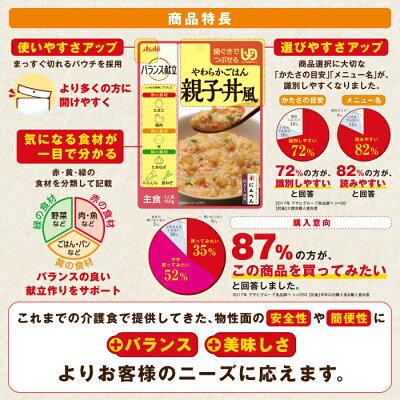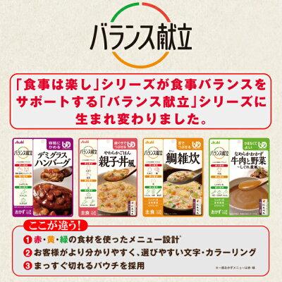 和光堂としてこれまで様々な介護食を提供してきましたがこの度ブランド名をアサヒに変更し、それに伴い新たに介護食をバランス献立シリーズとしてリニューアルしました。バランス献立シリーズはこれまでの介護食に比べおいしさとバランスがパワーアップしております。