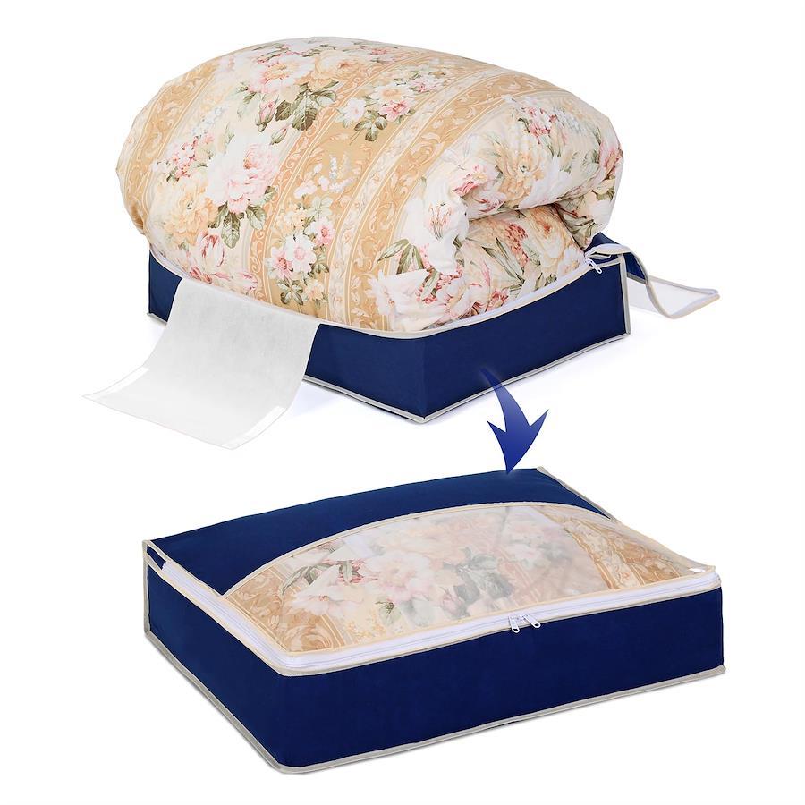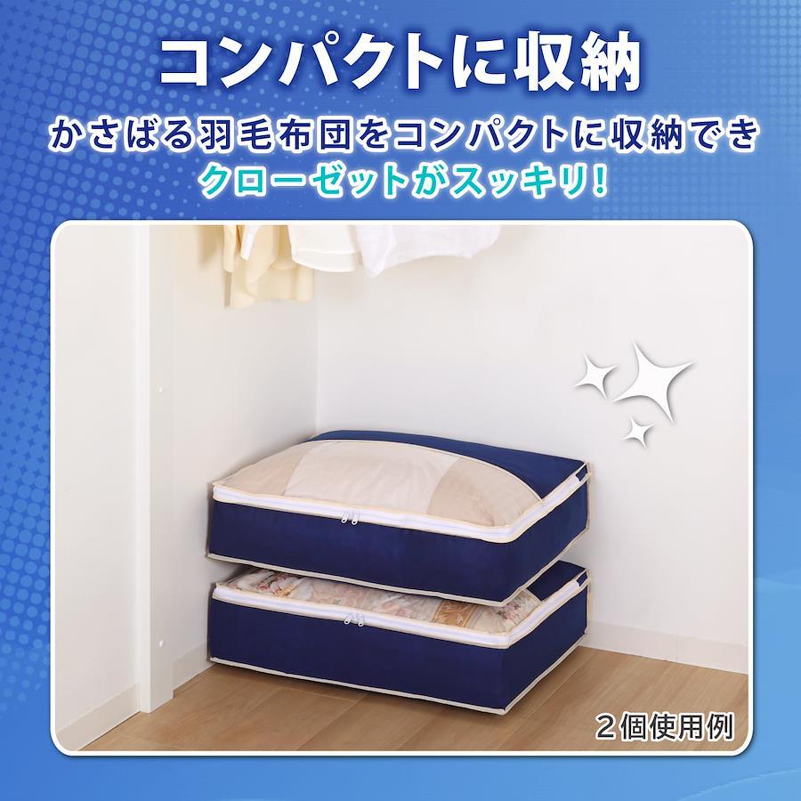 【カラー】:ネイビー【収納目安】:羽毛布団 シングル 1枚【通気性に優れた不織布製】:空気がこもるのを防ぎながら、大切な羽毛布団をホコリや汚れから守ります。【大きく開くファスナー】:三方に大きく開くファスナーでらくらく収納。【優しく収納】:押さえベルトでかさばる羽毛布団をやさしくコンパクトに収納。圧縮しすぎないので、次にご使用する際も羽毛がへたらず、出してすぐにご使用いただけます。急な来客時にも安心です。【噛み込み防止ファスナー付】:ファスナー開閉時の噛み込みを防止するベラ付きで収納時に羽毛布団が傷つくのを防ぎます。【透明窓付】:透明窓付きで取り出さずに収納物を確認出来ます。【ご注意】:アイロン・洗濯不可。