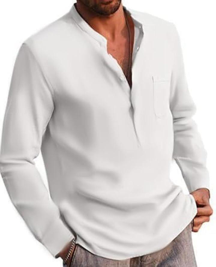 *周りと差をつけた着こなしが楽しめるヘンリーネックシャツ。