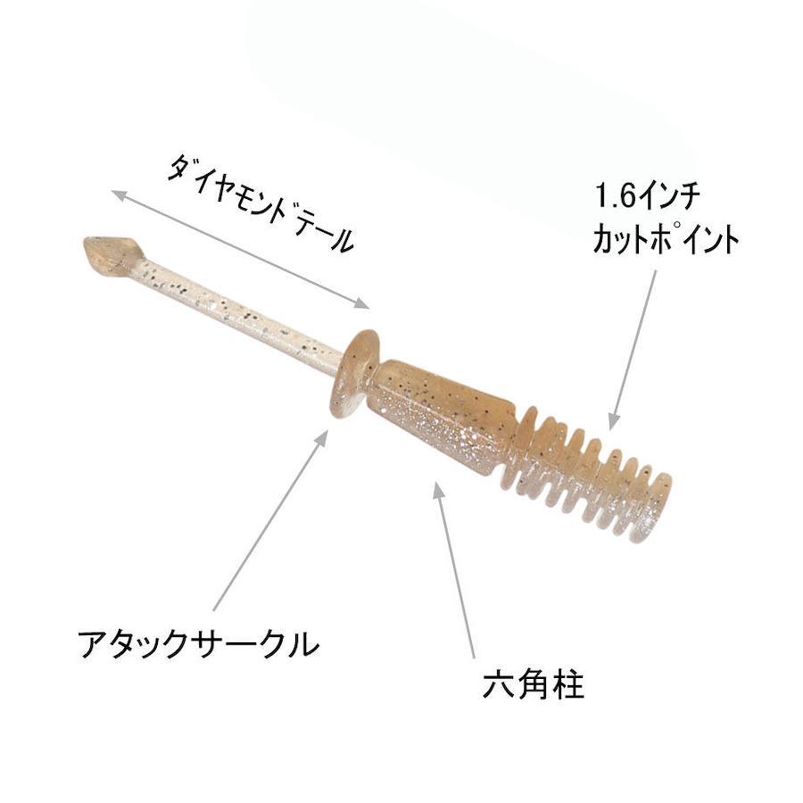 明確にあたりが手元に伝わるよう設計!極力引き抵抗を付ける為、深めのリブ、センター付近にある薄い円盤(アタックサークル)を採用。少しの水流でも、微波動するように、テール先端を8面体にカット(ダイヤモンドテール)しました。本体中盤の六角柱の形状によるフラッシング効果も期待出来ます。深リブ部分にカットマークが入っており、1.6インチにカットしても水平バランスを保ちます。リグの操作感、バイトの多さを体感できるワームとなっております!