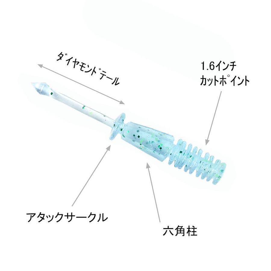 明確にあたりが手元に伝わるよう設計!極力引き抵抗を付ける為、深めのリブ、センター付近にある薄い円盤(アタックサークル)を採用。少しの水流でも、微波動するように、テール先端を8面体にカット(ダイヤモンドテール)しました。本体中盤の六角柱の形状によるフラッシング効果も期待出来ます。深リブ部分にカットマークが入っており、1.6インチにカットしても水平バランスを保ちます。リグの操作感、バイトの多さを体感できるワームとなっております!