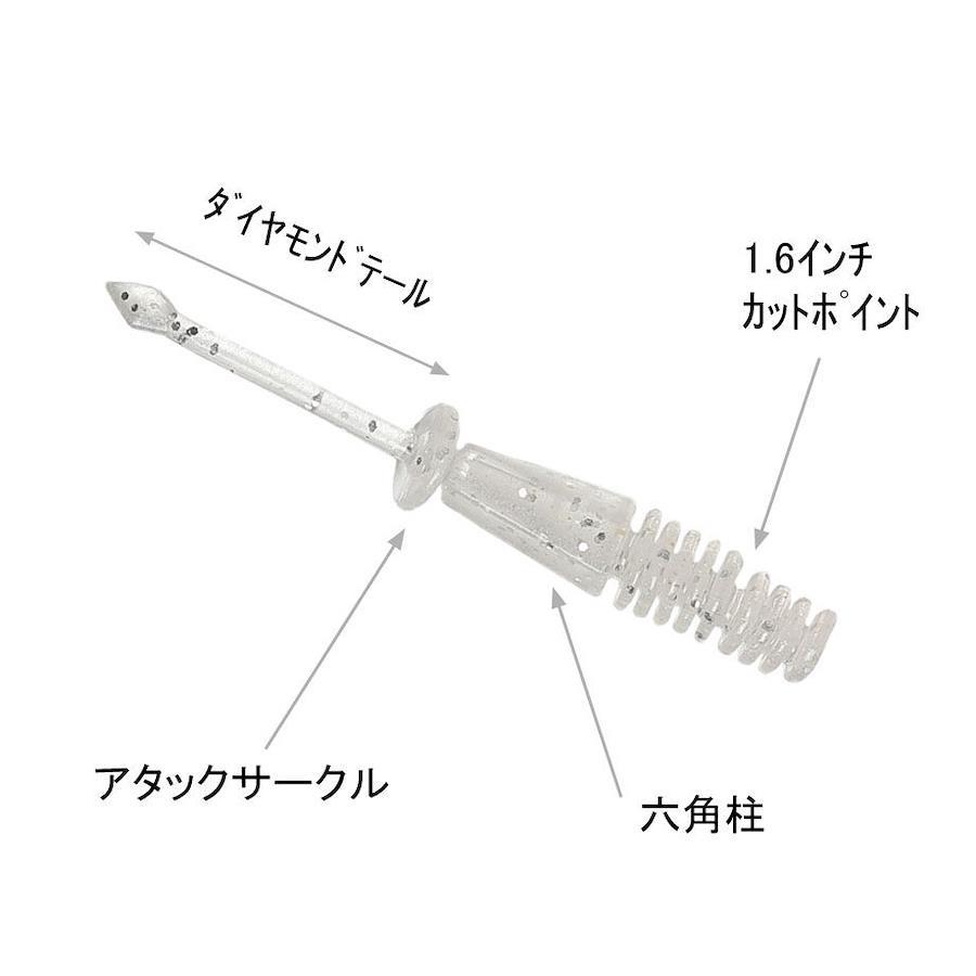 明確にあたりが手元に伝わるよう設計!極力引き抵抗を付ける為、深めのリブ、センター付近にある薄い円盤(アタックサークル)を採用。少しの水流でも、微波動するように、テール先端を8面体にカット(ダイヤモンドテール)しました。本体中盤の六角柱の形状によるフラッシング効果も期待出来ます。深リブ部分にカットマークが入っており、1.6インチにカットしても水平バランスを保ちます。リグの操作感、バイトの多さを体感できるワームとなっております!