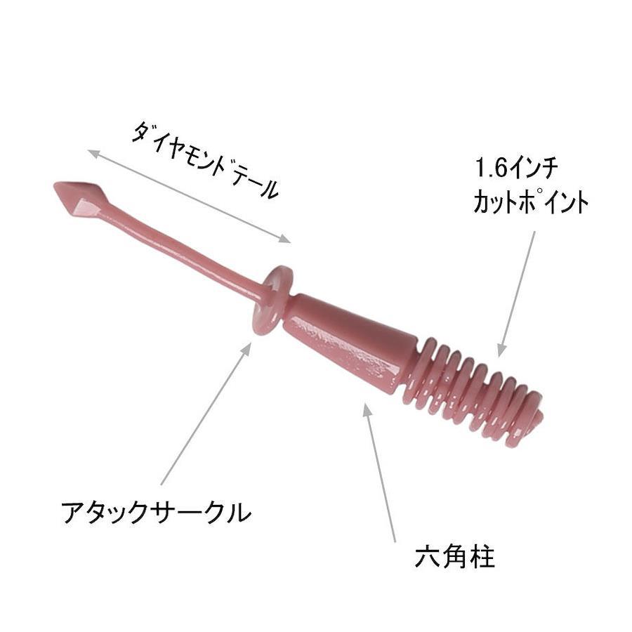 明確にあたりが手元に伝わるよう設計!極力引き抵抗を付ける為、深めのリブ、センター付近にある薄い円盤(アタックサークル)を採用。少しの水流でも、微波動するように、テール先端を8面体にカット(ダイヤモンドテール)しました。本体中盤の六角柱の形状によるフラッシング効果も期待出来ます。深リブ部分にカットマークが入っており、1.6インチにカットしても水平バランスを保ちます。リグの操作感、バイトの多さを体感できるワームとなっております!