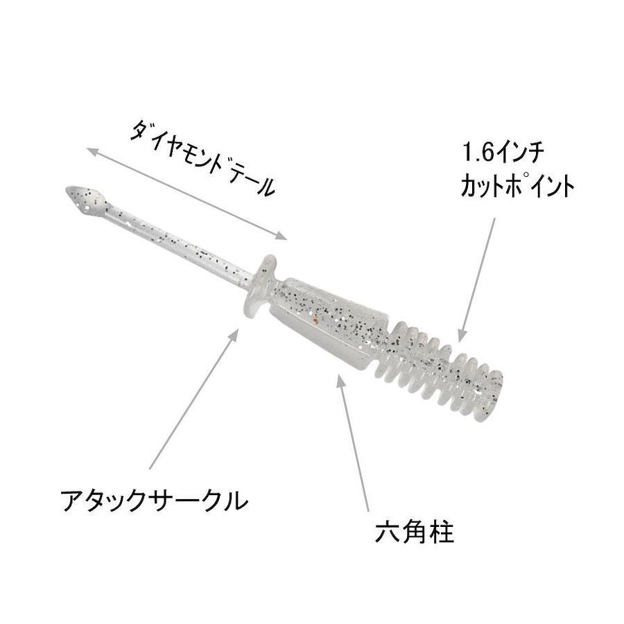 明確にあたりが手元に伝わるよう設計!極力引き抵抗を付ける為、深めのリブ、センター付近にある薄い円盤(アタックサークル)を採用。少しの水流でも、微波動するように、テール先端を8面体にカット(ダイヤモンドテール)しました。本体中盤の六角柱の形状によるフラッシング効果も期待出来ます。深リブ部分にカットマークが入っており、1.6インチにカットしても水平バランスを保ちます。リグの操作感、バイトの多さを体感できるワームとなっております!