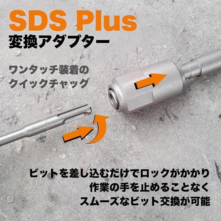 「SDS MaxをSDS Plusへ変換」 お手持ちのSDS Max(五坑)仕様の電動ハンマーやハンマードリルで、SDS Plus(円柄・2溝2ピット)のドリルビットが使用可能になる変換アダプターです。