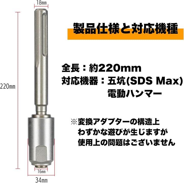 「製品仕様と対応機種」 全長:約220mm、対応機器:五坑(SDS Max)電動ハンマー。
