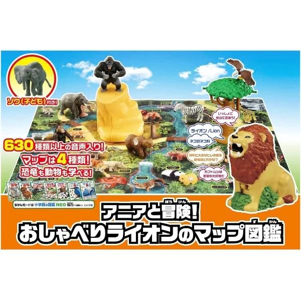 タカラトミー 『 アニアと冒険! おしゃべりライオンのマップ図鑑 (初回限定版) 』 動物 恐竜 リアル 動く フィギュア おもちゃ 3歳以上 玩具安全基準合格 STマーク認証 ANIA TAKARA TOMY おしゃべりライオンで、マップやアニアをタッチして一緒に学んじゃおう!630種類以上の音声入り!マップは4種類あるので、恐竜も動物も学べます。初回限定版には、ゾウの子どもが付いています。おしゃべりライオンをマップや別売のアニアにシールを貼ってタッチすると、おしゃべりします。音声モードは、おはなしモード、ずかんモード、クイズモードの全3種類。遊びながら生き物について学べます。・おはなしモード(136種類の音声が収録):お話を聞いて生き物たちと一緒に遊べます。・ずかんモード(352種類の音声が収録):生き物の名前や特徴を教えてくれます。※ずかんモードは小学館の図鑑NEO協力(フクイラプトル除く)・クイズモード(56種類の音声が収録):ずかんモードで学んだ生き物たちのクイズを聞いて正解を当てよう。別売のアニアに付属のシールを貼って、おしゃべりライオンでアニアをタッチして遊ぶこともできるので、アニアを使って遊びながら学ぶこともできます。付属のマップは、草原マップ、恐竜マップ、海マップ、極地マップの4種類。色んなところに住んでいる生き物たちが学べます。さらに情景パーツが付属しているので、アニアを使って木にとまったりつかまったり、岩に登ったり、滑り台などで遊ぶこともできます。【セット内容】おしゃべりライオン(1),滑り台(1),木(1),岩(組み立てた状態)(1),マップ 大(B3サイズ)(草原)(1),マップ 小(B4サイズ)(恐竜)(1),マップ 小(B4サイズ)(極地)(1),マップ 小(B4サイズ)(海)(1),シール(1),取り扱い説明書(1),両面シール(1),ゾウ(子ども)(1),