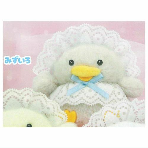 ふわふわでかわいいアヒルのあかちゃんがレースとリボンでガーリーにおめかししました!サテンのボンネットで後ろ姿もかわいい♪全種カラーボールチェーン付き!