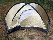 オニドームはグランドシートの形状とフレームラインを今までにない視点から設計した、新しい構造のテントです。 オニドームはペグダウンできない場合でも使える前室付で、居住性と使いやすさを最優先して作られた軽量モデルのテントです。 オニドームの名前の由来となった、前室を作るための2つの「つの」状の張り出し部分と、ユニークな台形のフォルムは従来のテントにはない余裕のユーティリティスペースをもたらします。 フレームは2本だけなのでドマドームよりも軽量です。