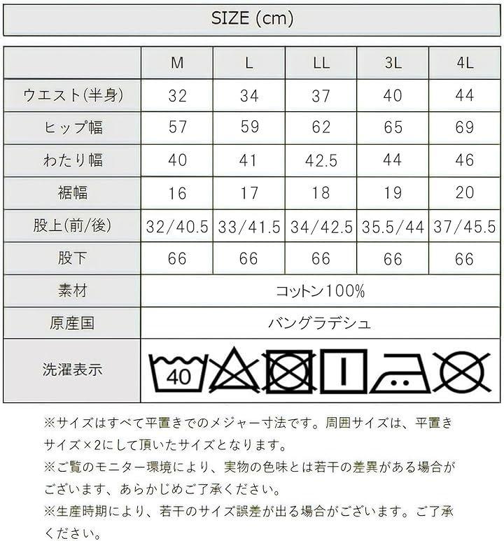 「サイズ」[Mサイズ]ウエスト(半身):32cm、ヒップ幅:57cm、わたり幅:40cm、裾幅:16cm、前股上:32cm、後股上:40.5cm、股下:66cm[Lサイズ]ウエスト(半身):34cm、ヒップ幅:59cm、わたり幅:41cm、裾幅:17cm、前股上:33cm、後股上:41.5cm、股下:66cm[LLサイズ]ウエスト(半身):37cm、ヒップ幅:62cm、わたり幅:42.5cm、裾幅:18cm、前股上:34cm、後股上:42.5cm、股下:66cm