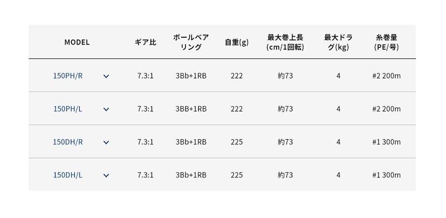 ギヤ比:7.3:1/ベアリング:3BB+1RB自重:225g糸巻量:PE 1号/300m最大ドラグ:4kg/最大巻上長:73cm