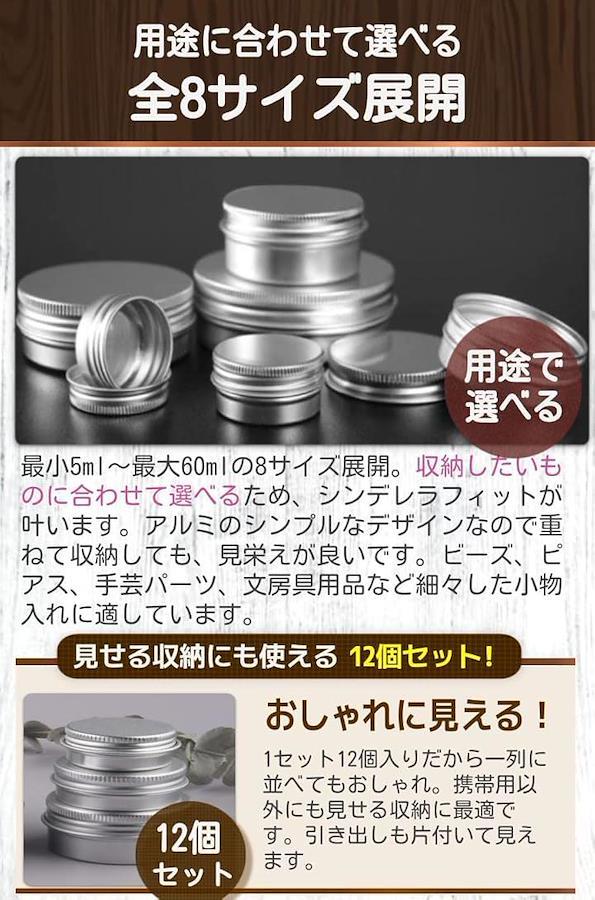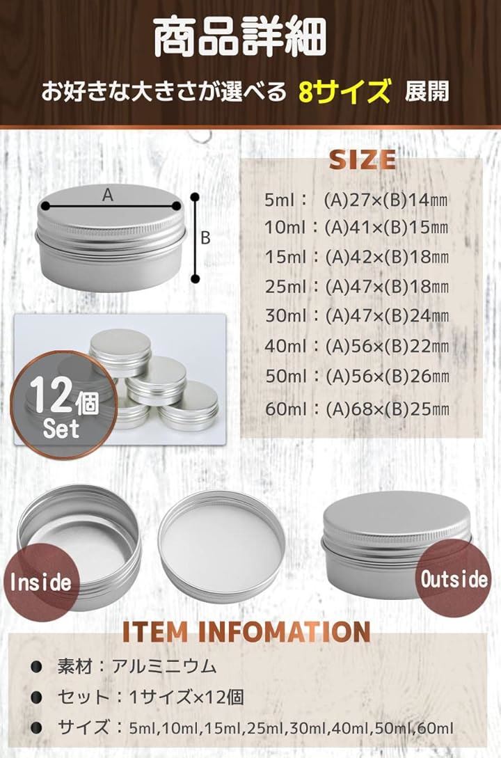 「商品詳細」 素材:アルミニウム セット:1サイズx12個 サイズ:5ml,10ml,15ml,25ml,30ml,40ml,50ml,60ml