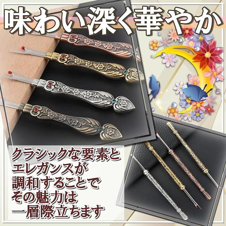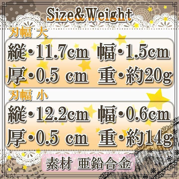 「サイズ」刃幅・・大 縦 11.7cm 横幅 1.5cm 厚さ 0.5cm 重さ 約20g 刃幅・・小 縦 12.2cm 横幅 0.6cm 厚さ 0.5cm 重さ 約14g 「カラー」刃幅大+小ともにゴールド、シルバー、ブロンズ、シャンパンゴールドの4色 「12バリエーション」刃幅大・・4色 各1種 刃幅小・・4色 各1種 刃幅大+小・・4色 各1セット