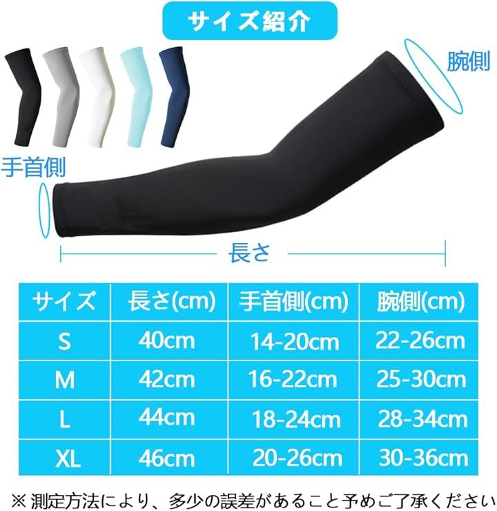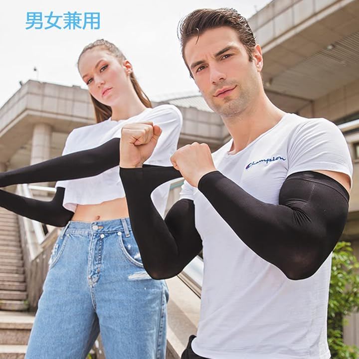 「素材構成」 92%ポリエステル+8%スパンデックスの高弾力繊維、接触冷感、UVカット率99%、伸縮性と通気性優れ、シリコン滑り止め付き;「適用対象」メンズ、レディース、男女兼用 、左右2枚セット;「サイズ」S、M、L、XL;「カラー」ブラック、ホワイト、グレー、ネイビー、ブルー。