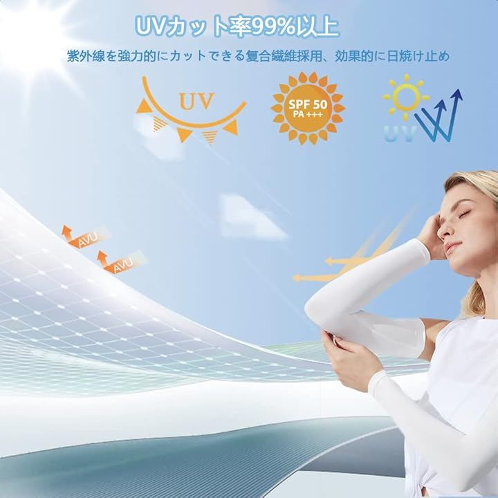 「冷感アームカバー」肌に優しい冷感材質を採用し、風が当たてひんやりとした着心地を体感できる。