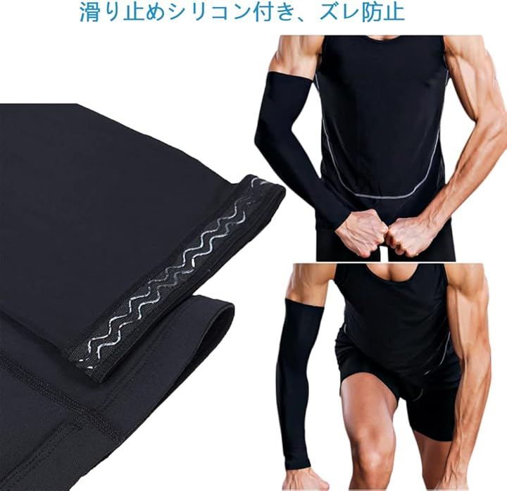 アームカバー上腕口には滑り止めシリコンが加工されており、腕にしっかりと固定し、ズレを有効的に防止できます、バスケットボールのような激しいスポーツにも安心。