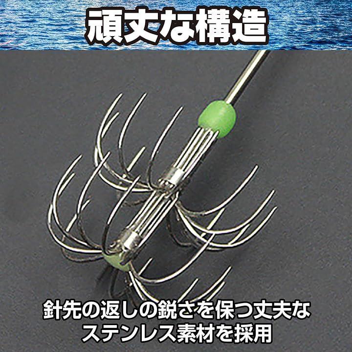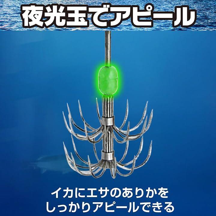 「夜光玉付きで暗闇でも高い視認性」このイカフックには、夜釣りに必須の夜光玉が取り付けられており、暗い海でもしっかりと視認できます。