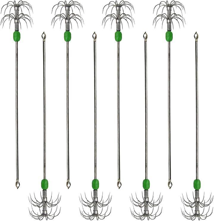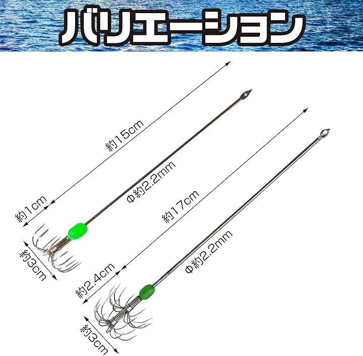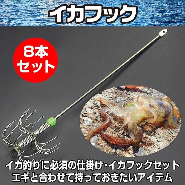 「商品仕様」タイプ : イカフッ ク 数量:8本 夜光玉付き 傘フック2層 収納ケース付き 長さ:170mm 重さ:8.5g フック幅:30mm シャフト径:2.2mm ステンレス製 カラ-:シルバー 対象魚:タコ、イカなど。