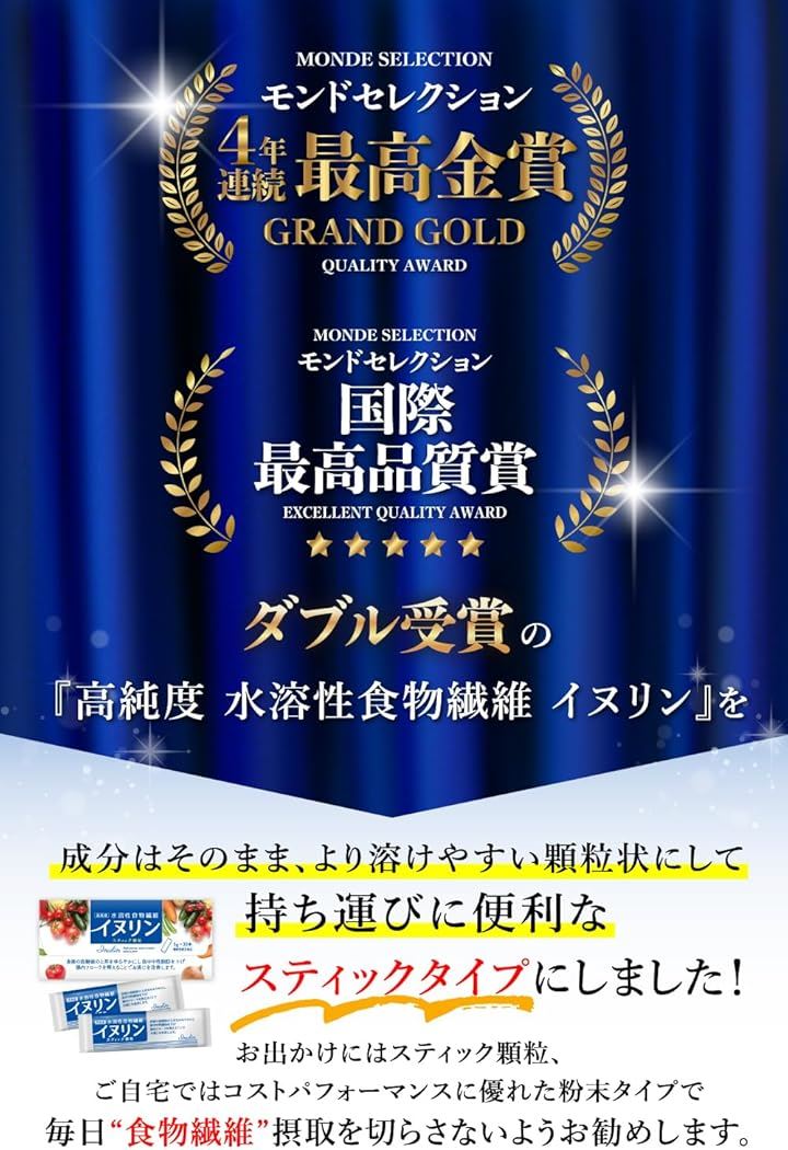 モンドセレクション4年連続最高金賞&国際最高品質賞ダブル受賞の「高純度 水溶性食物繊維 イヌリ」を、成分はそのまま、より溶けやすい顆粒状にして、持ち運びに便利なスティックタイプにしました。お出かけにはスティック顆粒、ご自宅ではコストパフォーマンスに優れた粉末タイプで毎日の食物繊維摂取を切らさないようお勧めします。