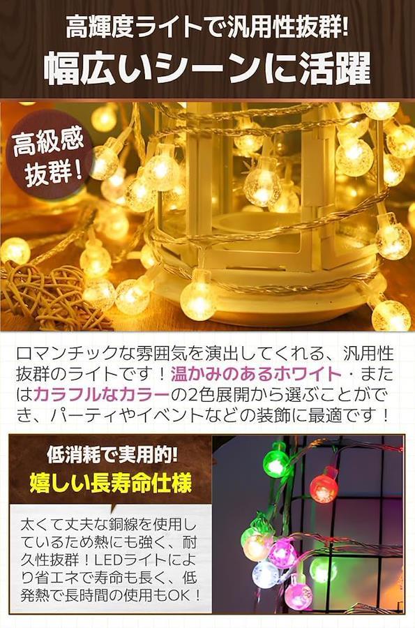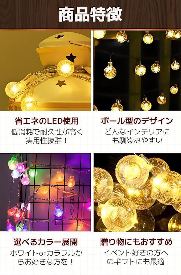 「商品特徴」(1)省エネのLED使用:低消耗で耐久性が高く実用性抜群。/(2)ボール型のデザイン:どんなインテリアにも馴染みやすい/(3)選べるカラー展開:ホワイトorカラフルからお好きな方を。/(4)贈り物にもおすすめ:イベント好きの方へのギフトにも最適