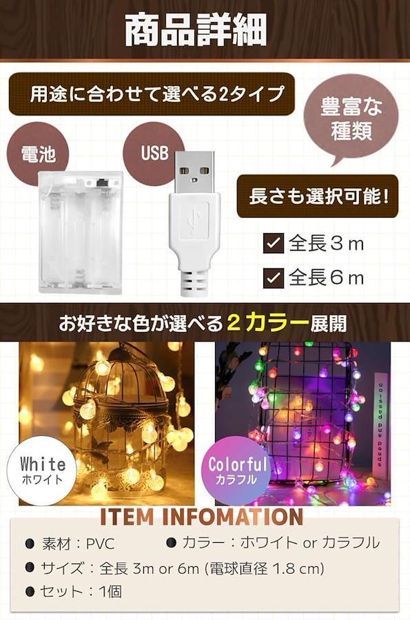 「商品詳細」カラー:ホワイト or カラフル素材:PVC/サイズ:全長 3m or 6m (電球直径 1.8 cm)/セット:1個/