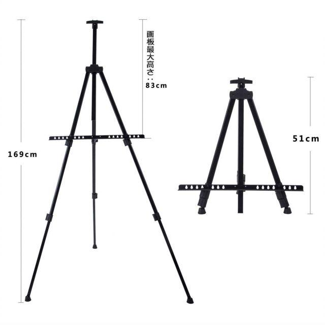 【折りたたみ式イーゼル】最大高さは169cmで、収納するときは約51cmになります。メタルイーゼルはサポート最大キャンバスの高さが83cmぐらいです(横置きでF40号、縦置きでF25号程度が使用できます)。