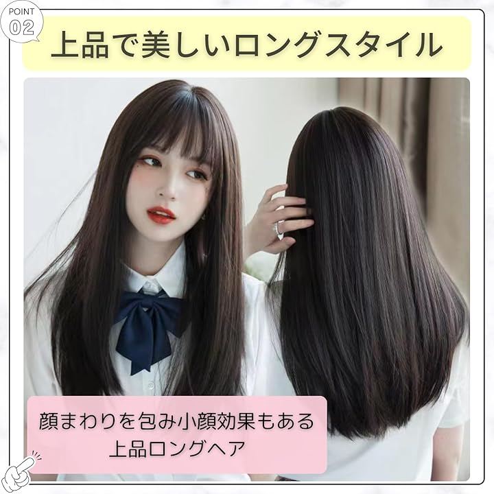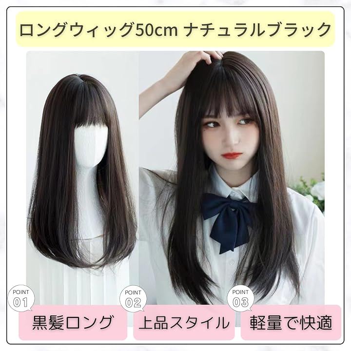「上品で美しいロングスタイル」長さ約50cmの黒髪ウィッグは、顔まわりをやさしく包み込みながら上品な印象を演出。