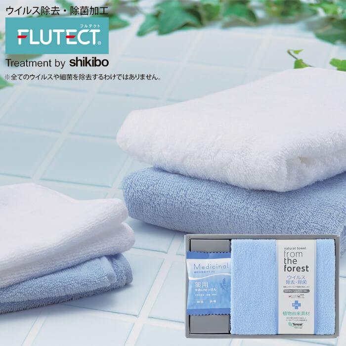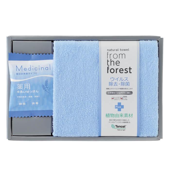 ウイルス除去・除菌加工タオルと薬用手洗い石鹸のセット ブルー SE3-450-2 ウイルス除去・除菌 抗ウイルス加工 プレゼント 記念品 景品 敬老の日 お誕生日 七五三 再生可能な木材から抽出したリヨセルのブランド繊維配合 繊維上の特定のウイルスや細菌を除去 御礼 お祝い