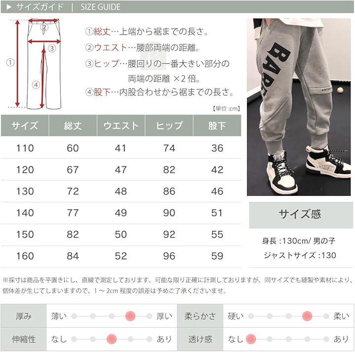 サイズ:パンツ丈/ウエスト/ヒップ/股下 「100」 58/39/70/32 「110」 60/41/74/36 「120」 67/47/82/42 「130」 72/48/86/46 「140」 77/49/90/51 「150」 82/50/92/55 「160」 84/52/96/59