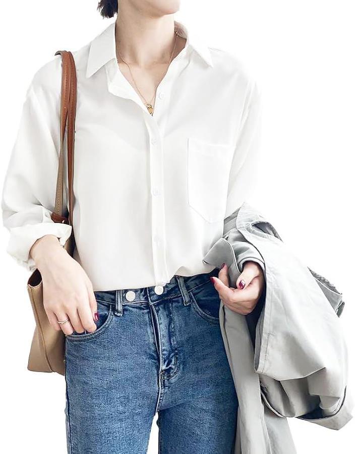 柔らかい雰囲気と女性らしい印象を与える長袖無地シフォンブラウス。