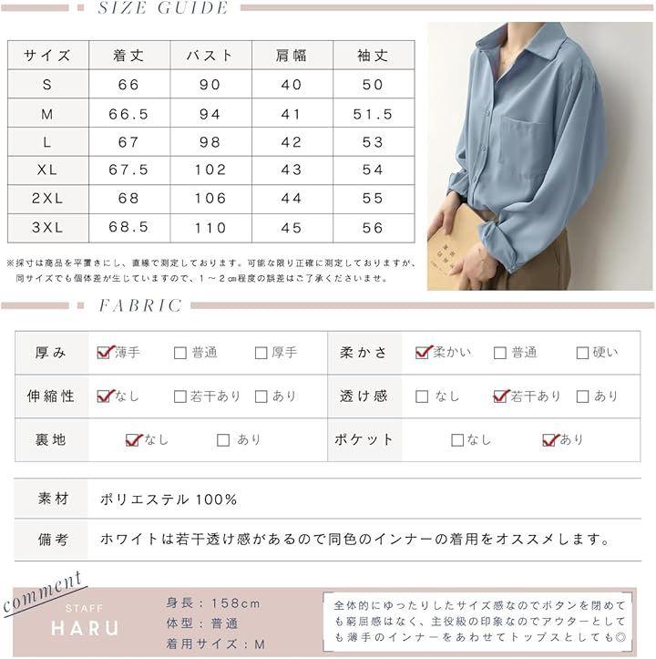 「Size」着丈/バスト/肩幅/袖丈 「S」 66/90/40/50「M」 66.5/94/41/51.5 「L」 67/98/42/53 「XL」 67.5/102/43/54 「2XL」 68/106/44/55 「3XL」 68.5/110/45/56 *採寸は平置きにし、直線で測定しております。