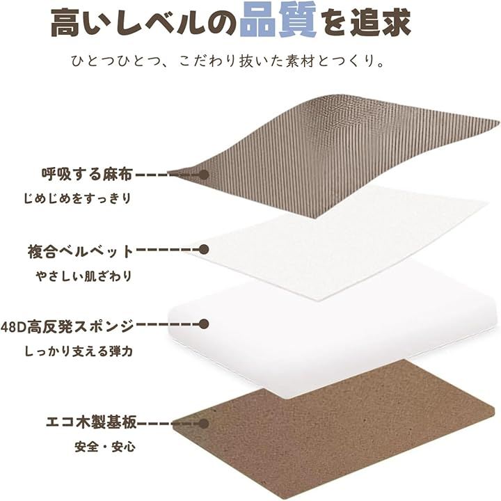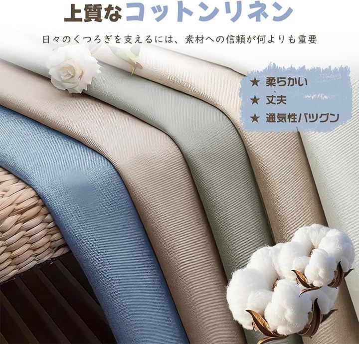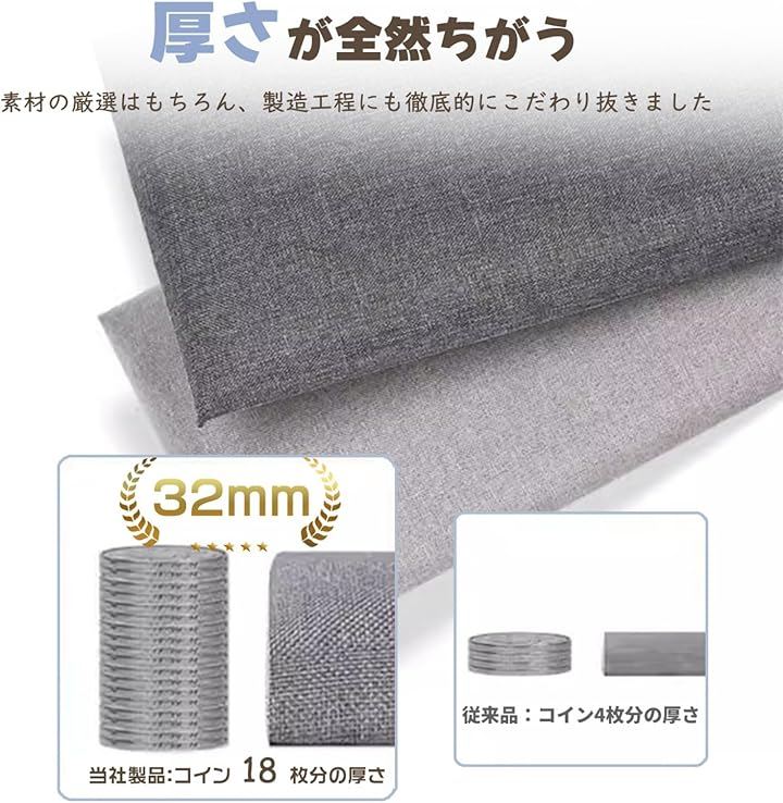 「素材へのこだわり」肌に触れる表面はコットンリネン風のやさしい素材でありながら、内部には厚さ32mmの高反発スポンジを採用しています。