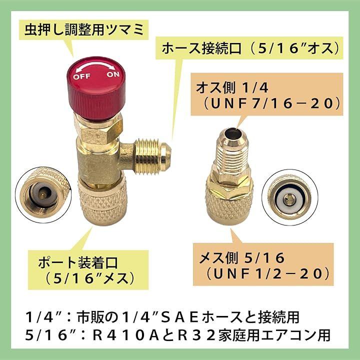5/16インチと1/4インチの変換アダプター付きで様々なエアコンに対応いたします、