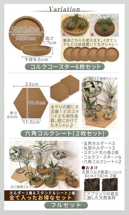 「バリエーション」*五角ホルダーx3、*丸型ホルダーx3、*スタンド大小各2個、*コルクコースターx6、*六角コルクシートx2、*フルセット(五角ホルダーx3、丸型ホルダーx3、スタンド大小各2個、コルクコースターx6、六角コルクシートx2全て入ったお得なセット。天然コルク樹皮ミニサイズ2個のおまけつき