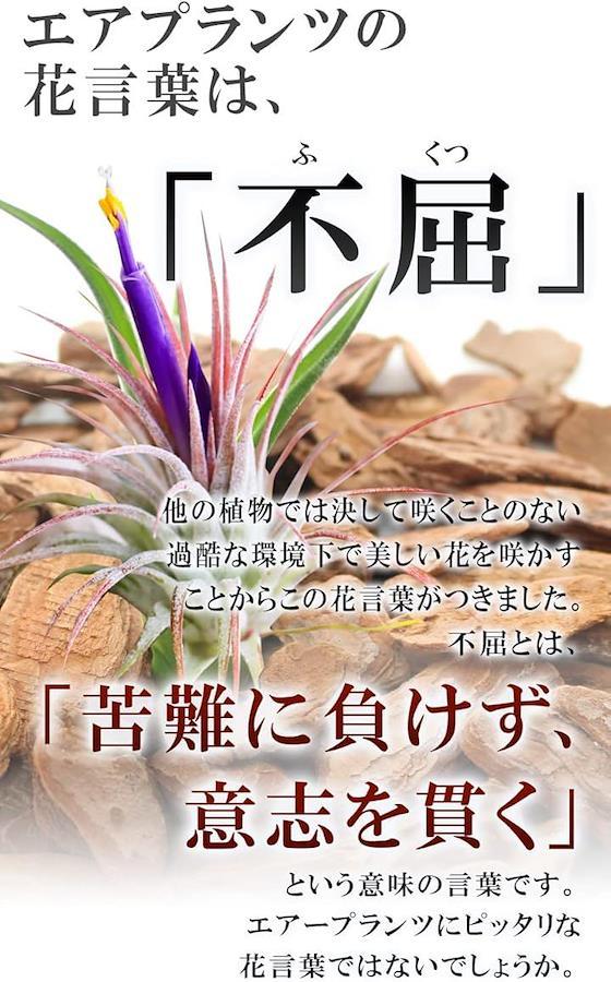 「エアプランツの花言葉「不屈」」他の植物では決して咲くことのない過酷な環境下で美しい花を咲かすことからきています。