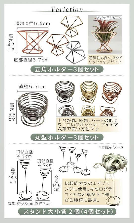 「お好みで選べる、おしゃれなデザイン」五角形、丸型ホルダーはさかさまにしても小さなエアプランツを飾れます。
