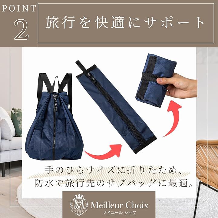 「旅行を快適にサポート」 手のひらサイズに折りたためるため、スーツケースに忍ばせて旅行先でのサブバッグに最適。