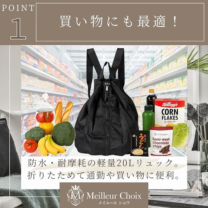 雨の日の買い物や混雑した店内でも使いやすく、20Lの容量で食料品や日用品までしっかり収納可能。