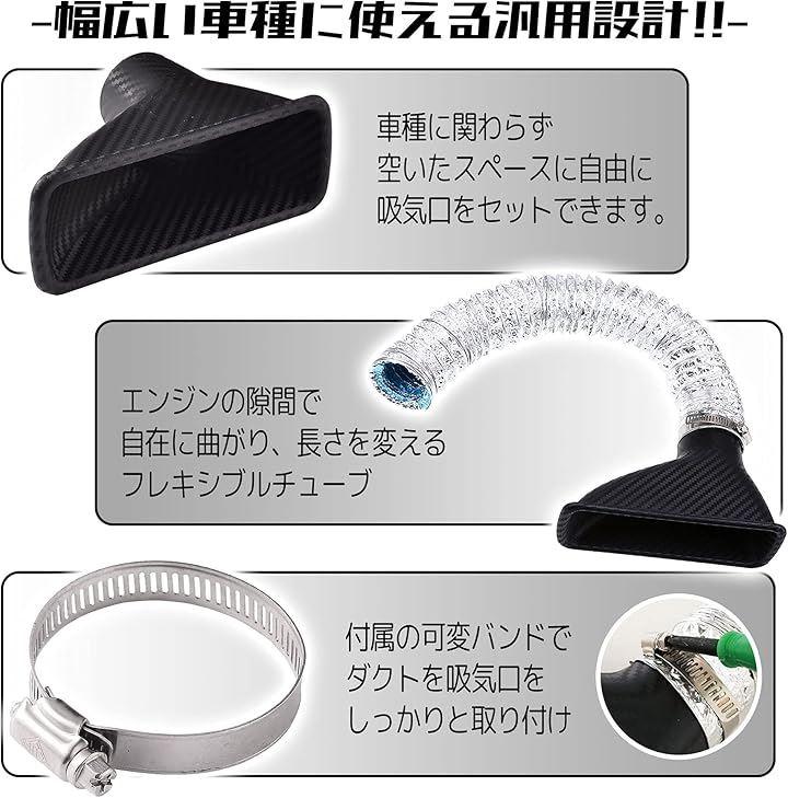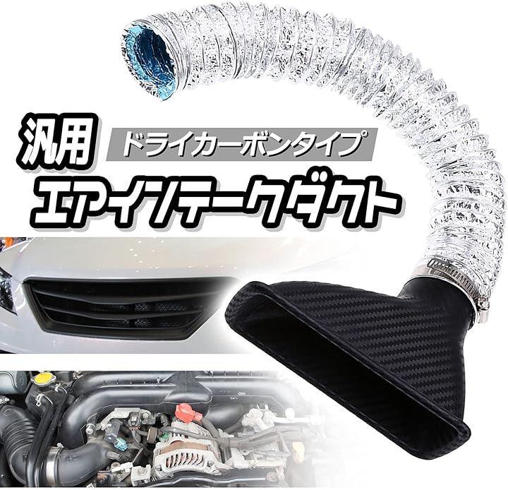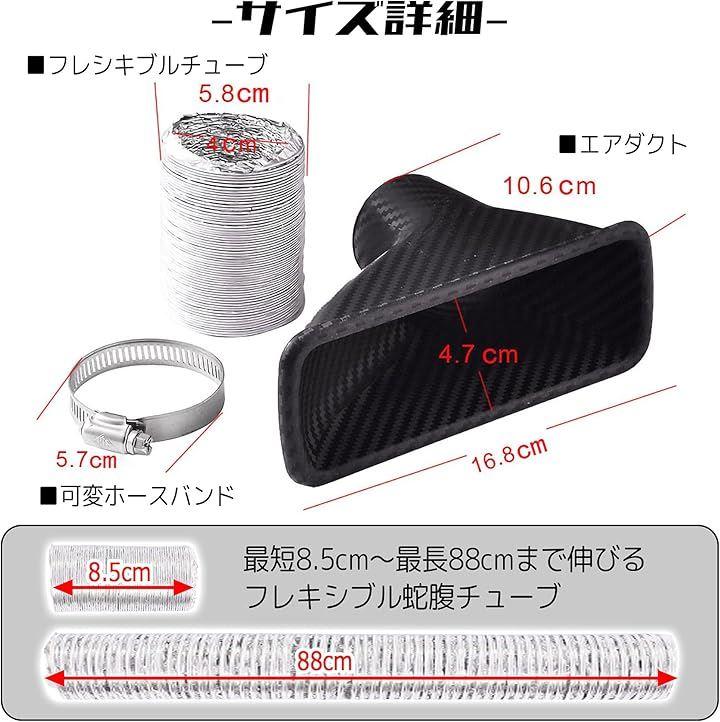 汎用ドライカーボン風エアダクトは、最大88cmまで伸縮可能なフレキシブルパイプを備えており、幅広い車種に対応します。