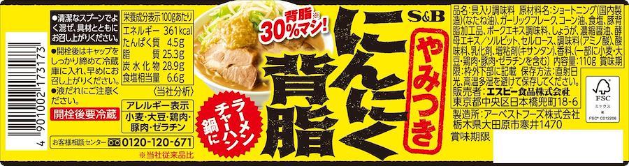 ショートニング(国内製造)(なたね油)、ガーリックフレーク、コーン油、食塩、豚背脂加工品、ポークエキス調味料、しょうが、濃縮醤油、酵母エキス/ソルビット、セルロース、調味料(アミノ酸)、酸味料、乳化剤、増粘剤(キサンタン)、香料、(一部に小麦・大豆・鶏肉・豚肉・ゼラチンを含む)