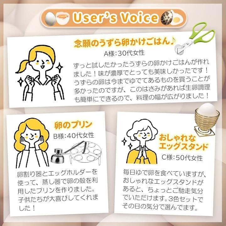 「うずらの卵カッター」はさみ先端のリングの中にうずらの卵を入れて切るだけ。黄身を崩さず簡単・キレイ。ちょきっとカットで簡単にパカッと割れます。納豆や長芋のとろろに乗せたりざるそばや卵かけごはんでお楽しみいただけます。