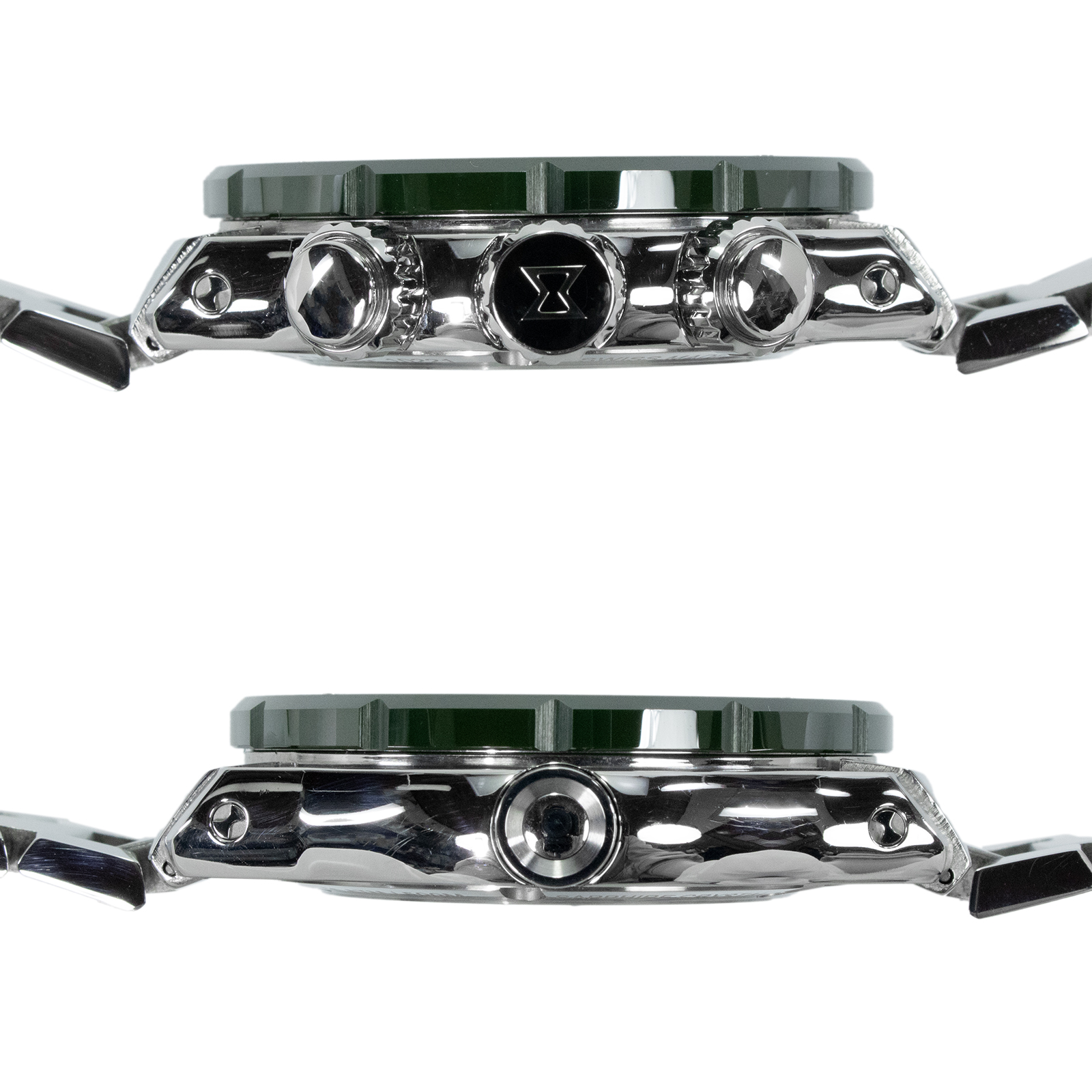 ねじ込み式のリューズやクロノグラフボタン、逆回転防止ベゼルなど、本格的なダイビングにも対応可能な機能を備えております。