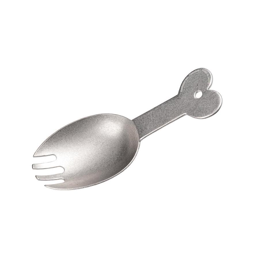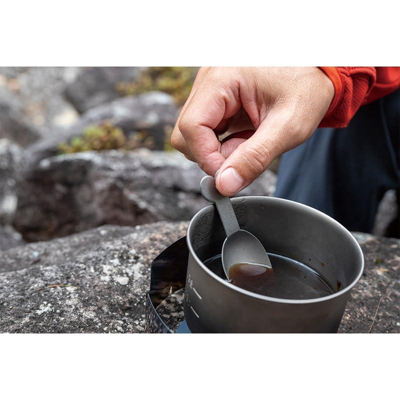 「Ti 400FD Cup」、「Ti 400 NH」の底にスッポリ、フラットに収納可能。通常サイズのまま、柄を短くしたチタン製カトラリー。グリップエンドをハート型にすることで短い柄でも使いやすく、突き刺す、掬う能力は普通のスプーンと同じ小型スプーンにありがちな使い勝手の悪さはありません。