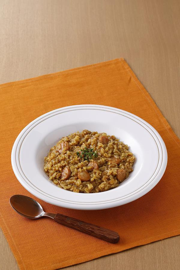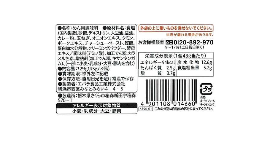 【原材料】食塩(国内製造)、砂糖、デキストリン、大豆油、醤油、カレー粉、玉ねぎ、オニオンエキス、クミン、ポークエキス、チャーシューペースト、鰹節、蛋白加水分解物、クリーミングパウダー、酵母エキス/調味料(アミノ酸)、加工でん粉、カラメル色素、増粘剤(加工でん粉、キサンタンガム)、(一部に小麦・乳成分・大豆・豚肉を含む)【栄養成分】1個43g当たりエネルギー(kcal)94、たんぱく質(g)2.5、脂質(g)3.7、炭水化物(g)12.6、食塩相当量(g)5.2【アレルゲン】小麦、乳成分、大豆、豚肉