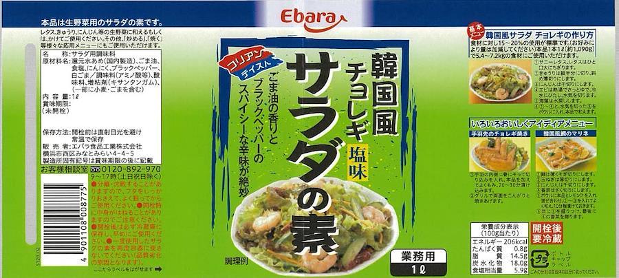 食材に対し15~20%の使用が標準です。(お好みにより量は加減してください)本品1本1L(約1,090g)で5.4~7.2kgの食材にご使用いただけます。1.サニーレタス、レタスは一口大にちぎります。2.きゅうりは縦半分に切り、斜め薄切りします。3.にんじんは千切りにします。4.エビは熱湯でさっとゆで、冷水にひたし、水気を切ります。5.海藻は水戻しします。6.1~4と、水気を切った5をボウルに入れ、本品で和えます。