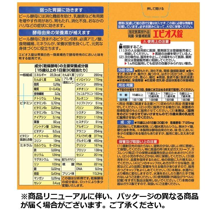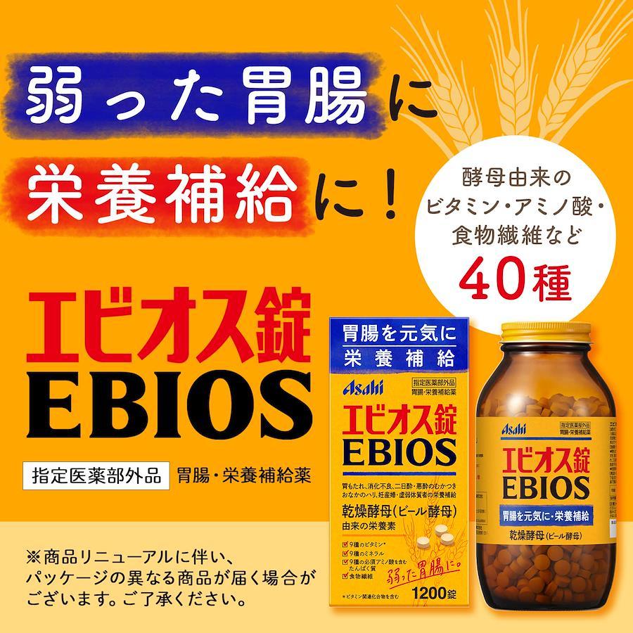 ●エビオス錠とは、乾燥酵母(ビール酵母)から生まれた指定医薬部外品です。●胃もたれ、消化不良、胃部・腹部膨満感 ●食べすぎ、飲みすぎ、胸やけ、胸つかえ、はきけ(むかつき、二日酔・悪酔のむかつき、悪心)、嘔吐 ●胃弱、食欲不振(食欲減退) ●栄養補給、栄養障害 ●妊産婦・授乳婦・虚弱体質者の栄養補給【用法・用量】下記の分量を1日3回、食後に水又はぬるま湯で服用してください。 15歳以上 1回10錠、11歳以上15歳未満 1回8錠、7歳以上11歳未満 1回5錠、5歳以上7歳未満 1回3錠、5歳未満の乳幼児 服用しないでください。※お子様は5歳以上から服用できます。※小児に服用させる場合には、保護者の指導監督のもとに服用させてください。※小児の手の届かないところに保管してください。【使用上の注意】