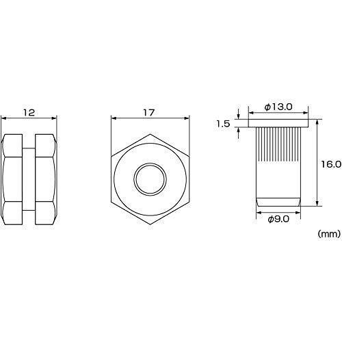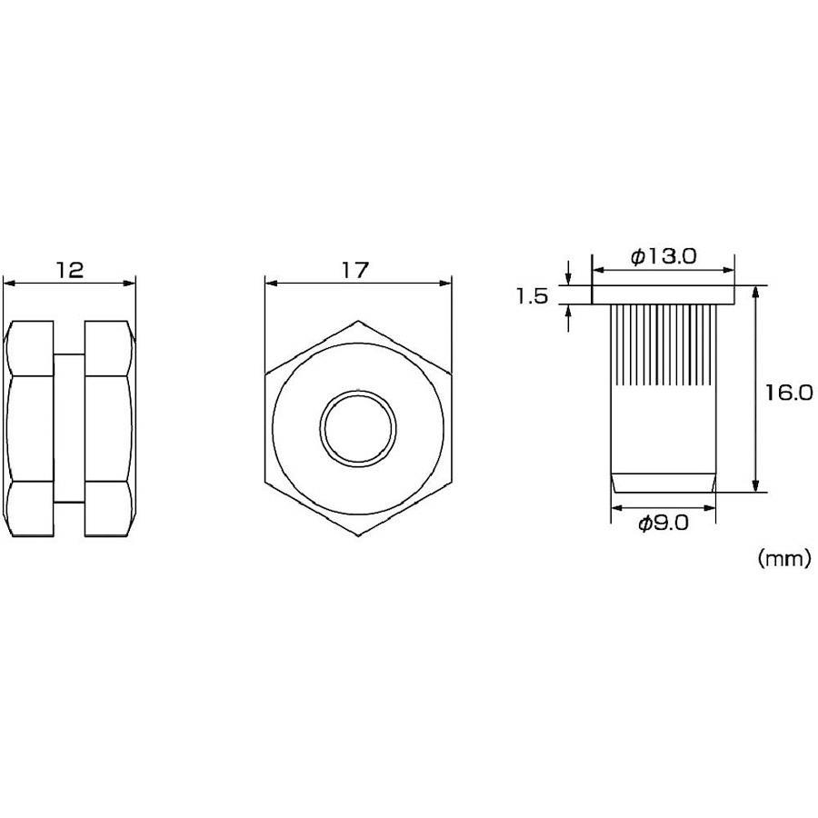 適正かしめ板厚:1.0~3.5mm下穴径:9.1mm取付ネジサイズ:M6ネジ梱包サイズ:2.0cm×15.0cm×15.0cm