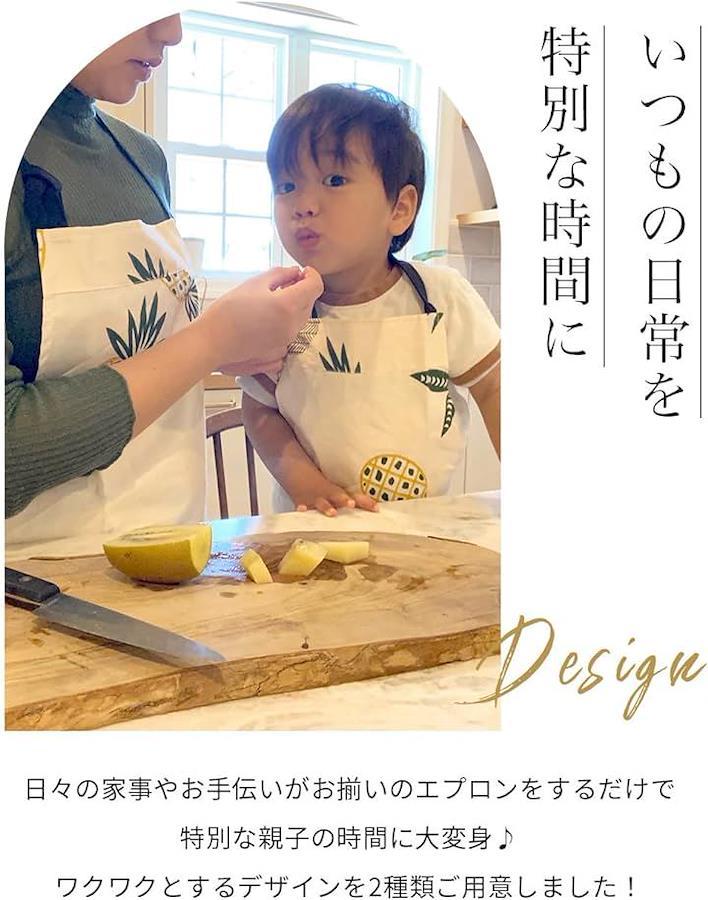 「色々なシーンで」おじいちゃんやおばあちゃんともお揃いができるようにプレゼントしても喜ばれること間違いなし。またママは家事をしていて忙しいときも、子供達はお店屋さんごっこやおままごとで一緒のエプロンをしているという事だけで一人遊びが楽しいひと時にきっとなってくれます。