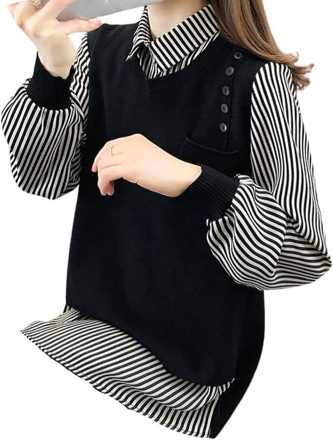 ストライプシャツにニットベストを重ね着したようなデザインのレイヤード風トップス。